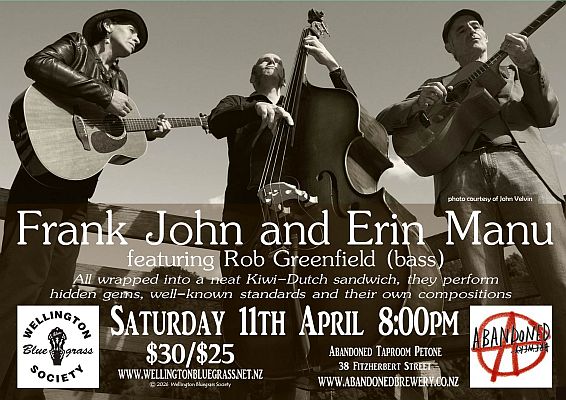 - Saturday 11th April, 8.00pm, concert featuring Frank John and Erin Manu with Rob Greenfield (bass) – Abandoned Taproom, Petone